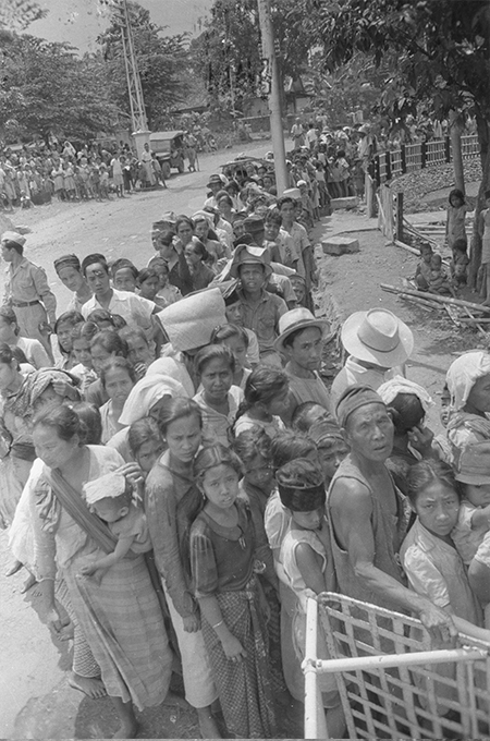 1947 - Java. Geduldig staat de bevolking in te wachten. Door UNRRA en Rode Kruis worden duizenden stuks kleding verstrekt aan de inwoners der pas bevrijde gebieden.