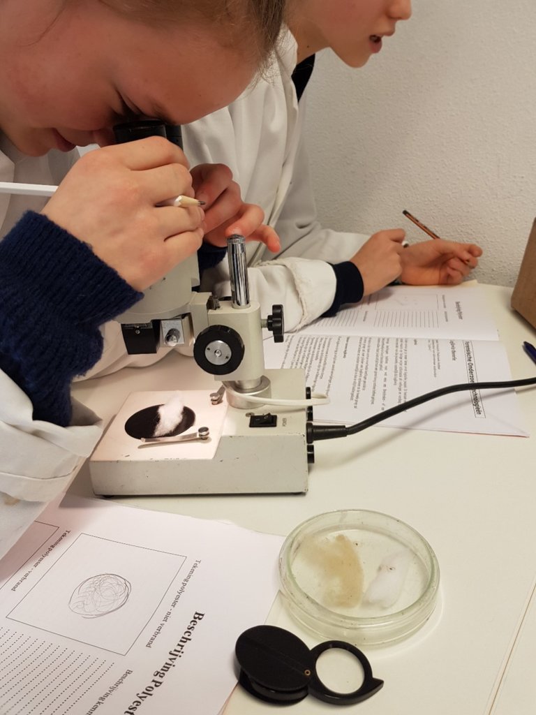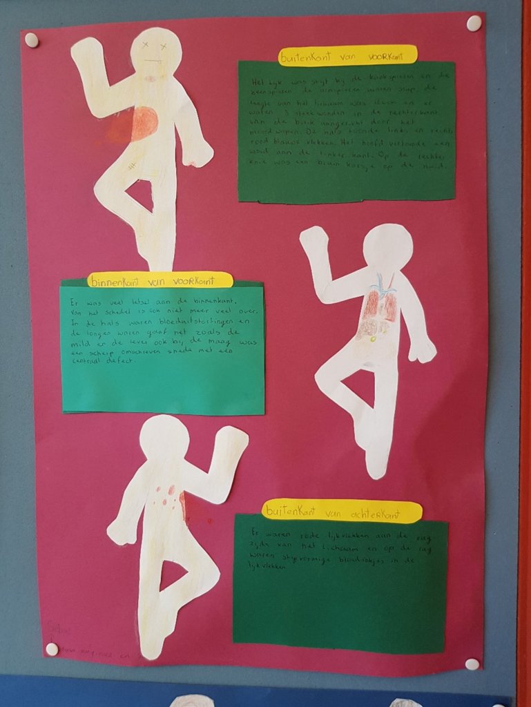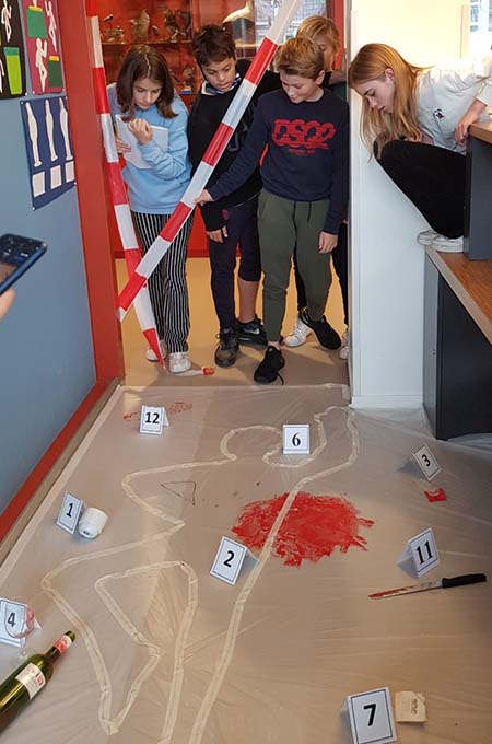 Leerlingen Ediah en Lieve uit klas 1C vertellen: 'We hebben al geleerd wat een lijkschouwing is, hoe je delen van een vingerafdruk kunt onderscheiden, en hoe je haarsoorten kunt herkennen. Elke les is heel leuk en interessant. Aan het eind van elke les valt er steeds één verdachte af, die Carola sowieso niet heeft vermoord. Soms vallen er ook meerdere verdachten af. Zo komen we steeds iets dichter bij de oplossing.'