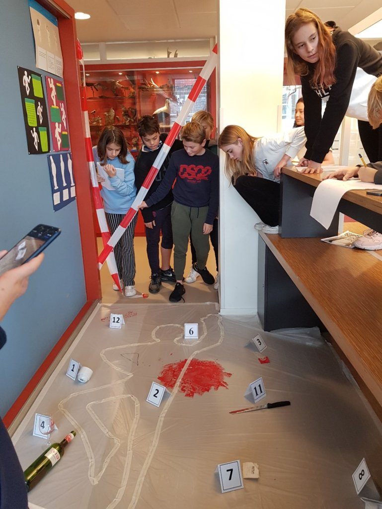 Leerlingen van de eerste klassen zijn in het kader van het vak X8 op het moment druk met de module ‘Mijn leraar is de Moordenaar’, waarbij een denkbeeldige moord op professionele wijze opgelost moet worden.
