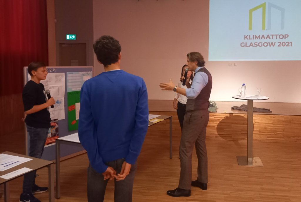 Donderdag 28 oktober hebben de leerlingen hun bijdrage tentoongesteld in de aula. De leider van de Nederlandse delegatie in Glasgow, Bastiaan Hassing, en de VN-jongerenvertegenwoordiger Duurzame Ontwikkeling, Aiofe Fleming, namen de bijdragen officieel in ontvangst en gingen met de leerlingen in gesprek