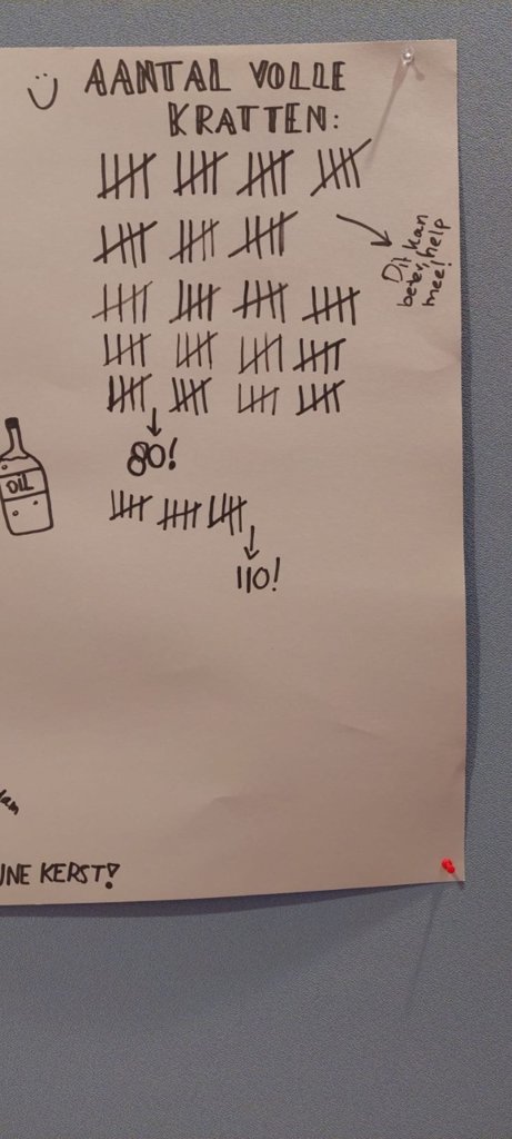 Het is gelukt om 110 kratten te vullen, waardoor de voedselbank weer in de maand december iets extra's kan doen voor gezinnen in Amsterdam.