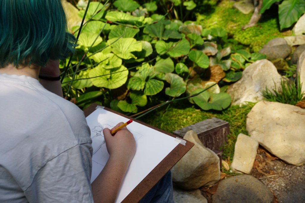 Leerlingen van klas 4 met tekenen tekenden op de zonovergoten dinsdagmiddag 9 september in de tuinen en de kassen van De Hortus Botanicus bladeren, takken, planten en composities daarvan.