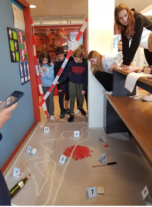 Foto 1. Leerlingen met hun politiebadges. Op vertoon mogen verdachte docenten worden geïnterviewd. Foto 2. Leerling-medewerker van politie Amstelland Amsterdam. Foto 3. Getuigen gezocht Foto 4. Het roerloze lichaam van Carola van Wijlen aangetroffen in de WiBi-gang van het Ignatiusgymnasium. Foto 5. Posters behorende bij het sectierapport waarin de aangetroffen verwondingen worden aangegeven. Foto 6. Ook op andere locaties worden sporen aangetroffen FoFoto 7. Vingerafdrukken onderzocht. F Foto 8. Aangetroffen vezels van plaats delict worden bekeken. Foto 9. Bloedsporenonderzoek belicht deze moordzaak vanuit een geheel ander perspectief.