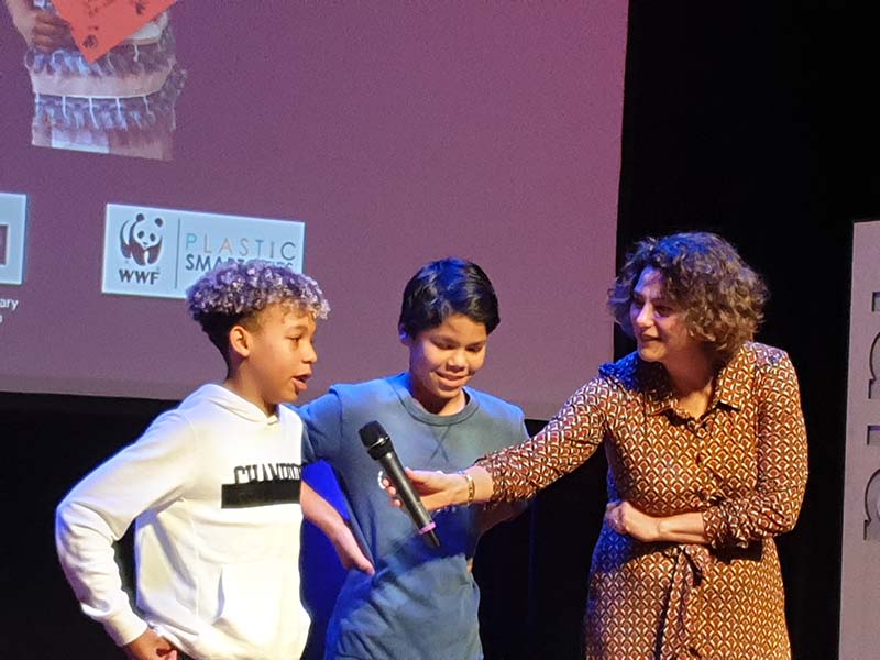 In de laatste week van het festival bezocht klas 1B het IDFA om gehuldigd te worden voor het winnen van het filmproject. De leerlingen werden feestelijke ontvangen en zowel wethouder Marieke van Doorninck (Duurzaamheid) als de directeur van het IDFA hield een lovende toespraak. Als klap op de vuurpijl werden Kylian en Joël ook nog eens geïnterviewd door AT5.