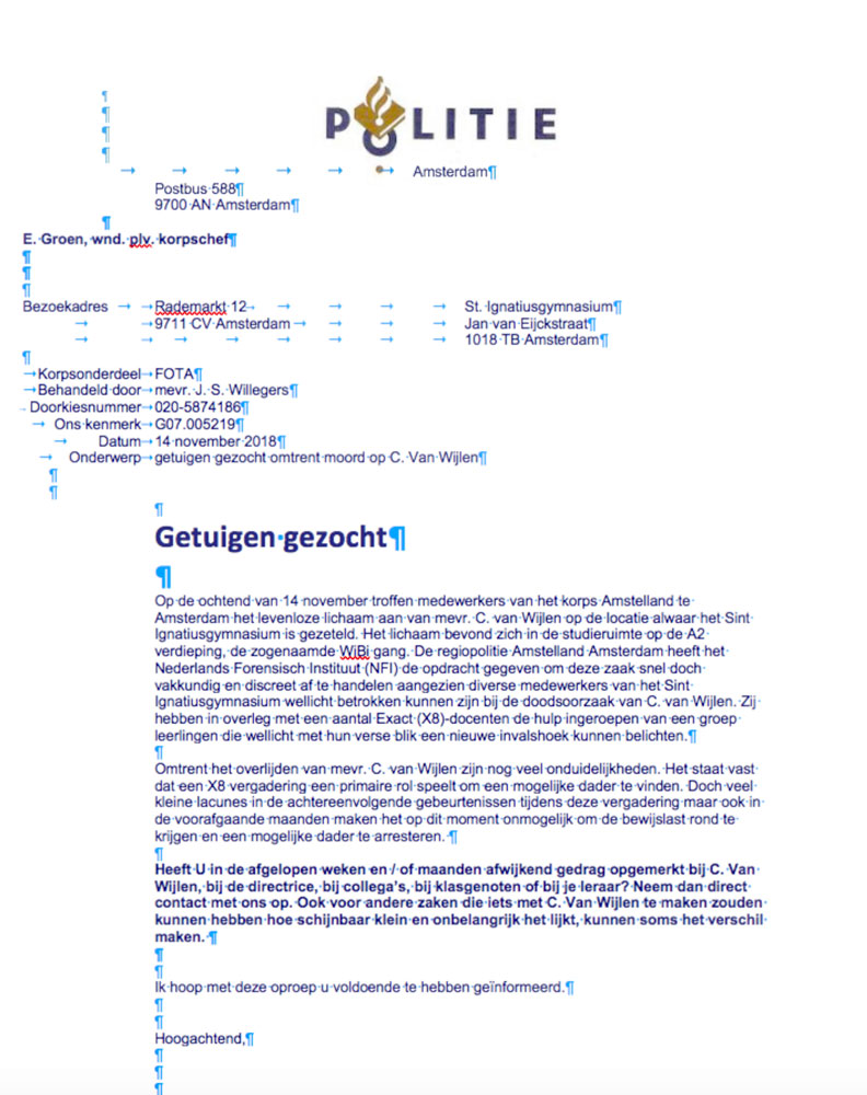 Op de ochtend van 14 november troffen medewerkers van het korps Amstelland het levenloze lichaam aan van mw. Carola van Wijlen. Er waren aanwijzingen dat diverse medewerkers van het St. Ignatiusgymnasium wellicht betrokken waren geweest bij de dood van de stagiaire. Het Nederlands Forensisch Instituut (NFI) riep daarom in overleg met een aantal X8-docenten van het Ignatius de hulp in van een groep leerlingen, die met hun frisse blik wellicht een nieuwe invalshoek konden belichten en zo konden helpen de bewijslast rond te krijgen. De vragen aan de leerlingen luidden: heb je in de afgelopen weken of maanden afwijkend gedrag opgemerkt bij C. van Wijlen, bij de rector, klasgenoten of je leraar? En zie je in de studieruimte waar het lichaam is gevonden sporen terug van de moord?