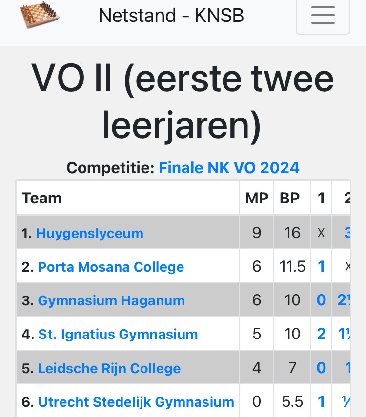 Uiteindelijk zijn ze vierde geworden van 6 finalisten in NK VO 2024, categorie eerste twee leerjaren. Richard, op bord 3 van het team heeft de prijs voor beste speler gewonnen en hij heeft zijn beker ontvangen van 7-voudig Nederlandse kampioen, Loek van Wely.